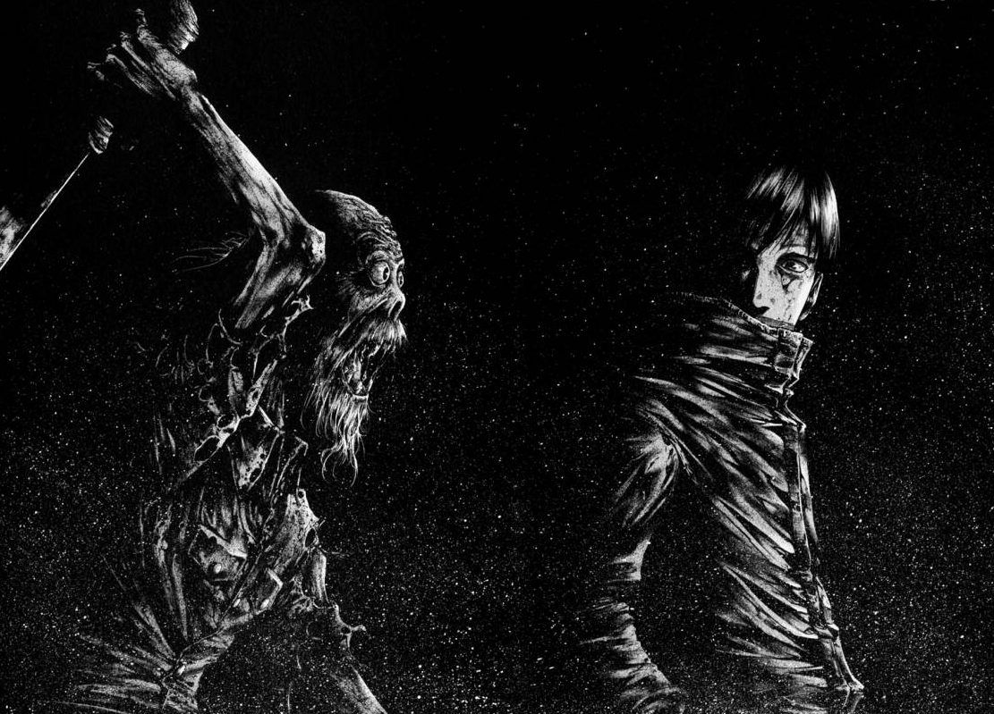 Me gustaría destacar el aspecto artístico de la obra, sin lugar a dudas, un apartado que eleva la calidad de la misma muy por encima de lo que me hubiera imaginado al leer la sinopsis. Kakizaki mantiene un estilo muy detallado, donde se puede apreciar la gran influencia que el cine aporta a nuestro artista. Podemos encontrar muchísimas páginas panorámicas que al leerlas dan una sensación de vértigo, terror y ansiedad, gracias a una composición artística más propia del cine que del manga, pero que igualmente destaca de una manera excepcional. Otro apartado donde se aprecia a la perfección esta influencia de la que hablo son los flashbacks que están a lo largo de todo el desarrollo de guion, retrocediendo al pasado y aportando una información de una manera ingeniosa y muy bien enlazada con la historia principal.
